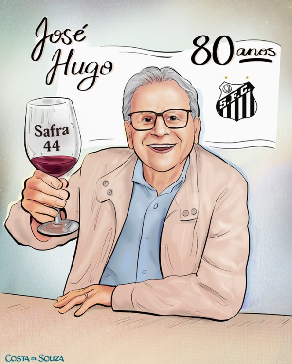 Caricatura para quadro em comemoração a um aniversário de 80 anos. O aniversariante torce pro Santos e adora beber vinho. Encomenda na opção Colorida, Completa.