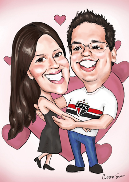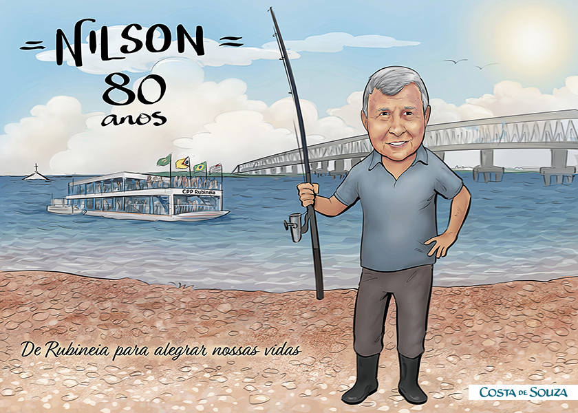 Caricatura para aniversário de 80 anos com tema Pesca, para cliente de Rubinéia, São Paulo, cidade na divisa com o Mato Grosso do Sul. A paisagem é uma ponte sobre o Rio Paraná, que divide os dois estados.