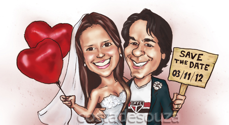 Caricatura dos noivos e arte do convite para casamento com inspiração no formato de jornal impresso. Encomenda na opção Colorida, completa.