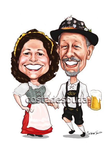Retrato ilustrado com tema Oktoberfest, para quadro e camisetas personalizadas. A cliente pediu para estar com o traje típico da festa e com um copo de chope. Ao fundo, uma paisagem rural de Blumenau.