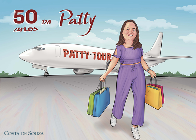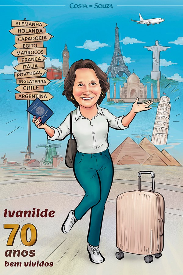Caricatura para aniversário de 70 anos com tema Viagem. Encomenda na opção Colorida, completa.