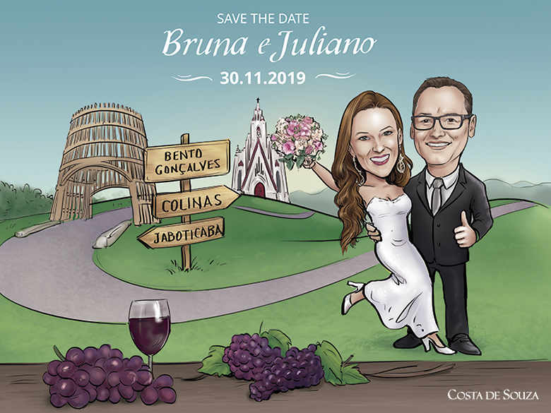 Caricatura para casamento com referências à cidade de Bento Gonçalves (RS), terra de ótimas vinícolas. Ilustração para uso em convite e Save the Date.