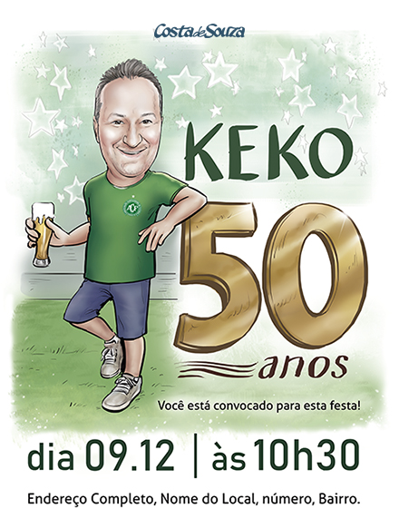 Caricatura para festa de aniversário de 50 anos com tema Futebol. O aniversariante torce pela Chapecoense.