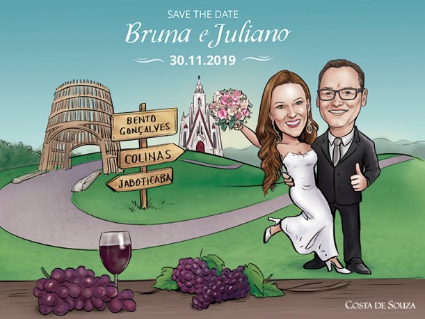 Caricatura para casamento com referências à cidade de Bento Gonçalves (RS), terra de ótimas vinícolas. Ilustração para uso em convite e Save the Date.